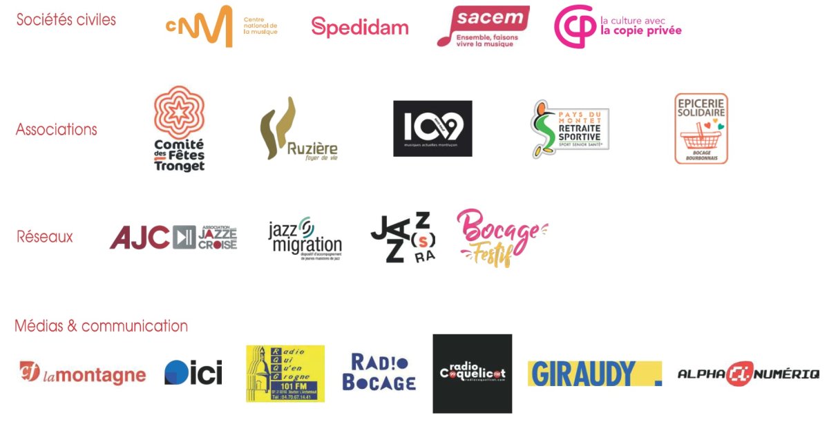 L'association Jazz dans le Bocage remercie tous ceux - partenaires, financeurs, Communes, fournisseurs, associations, adhérents, bénévoles... - qui, par leur soutien, leur collaboration, leur présence, leur professionnalisme et leur engagement, rendent possible toutes les activités.