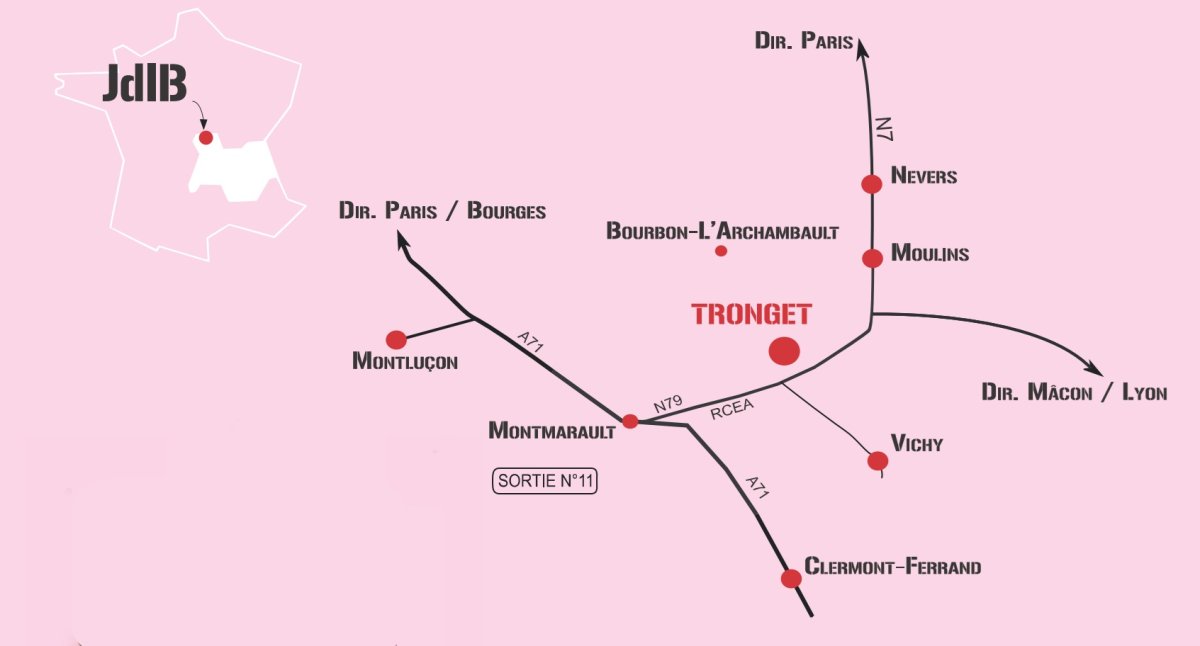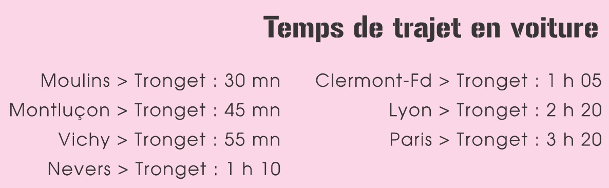 Les parkings sont prévus et fléchés à proximité de chaque lieu de concert. A Tronget, vous trouverez plusieurs parkings à proximité de la salle des fêtes ou bien du plan d'eau (les concerts ont lieu dans la Salle des Riats, rue des Riats).